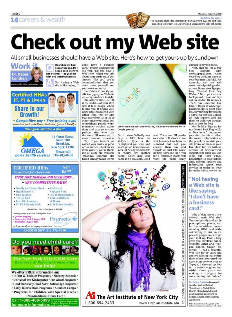 Condren, Debra. “Check out my Web Site.” Metro New York, Metro Boston, Metro Philadelphia, 28 July 2008: 14.