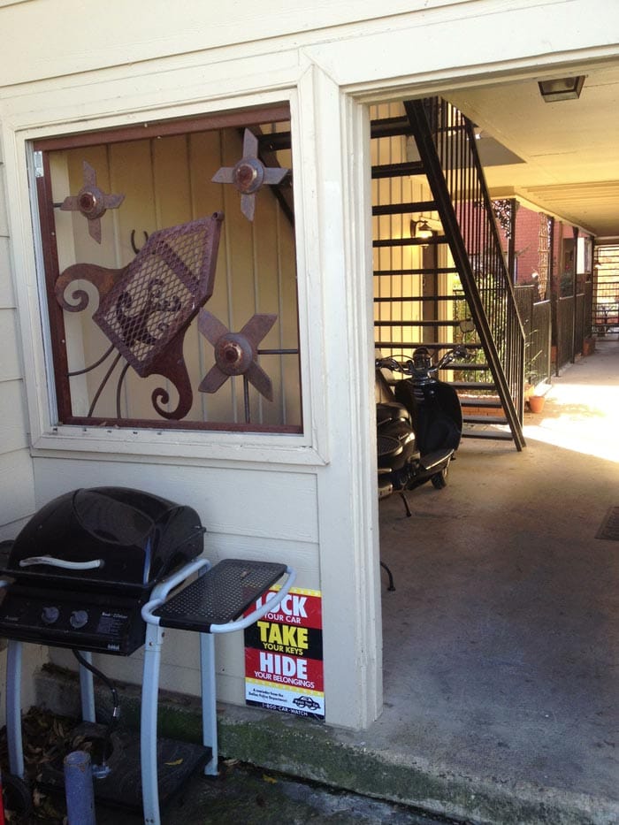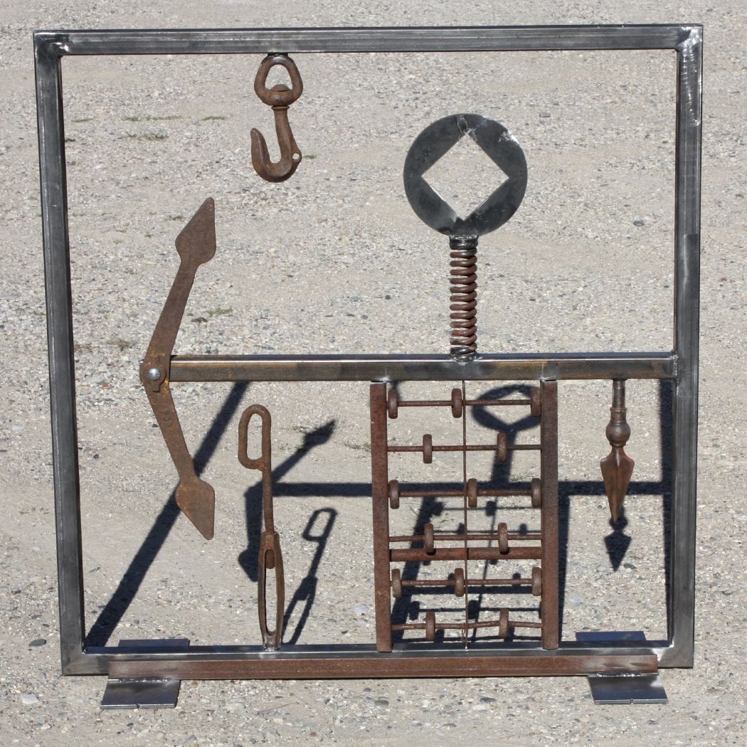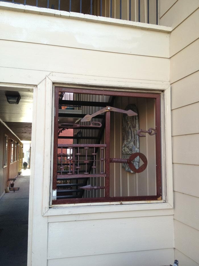These two grates are a commission for an apartment building in Texas. Both are made from recycled/reused components (other than the steel for the frame). Both grates have kinetic elements that spin, turn or bobble.