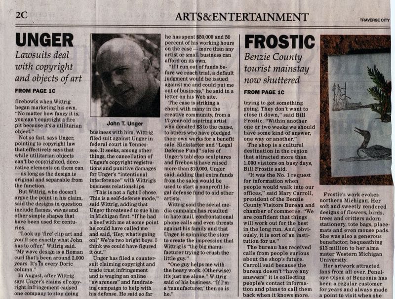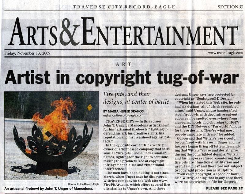Drahos, Marta H. “Artist in Copyright Tug-of-War.” Traverse City Record Eagle 13 Nov. 2009, Arts & Entertainment sec.: 1C-2C. Print.