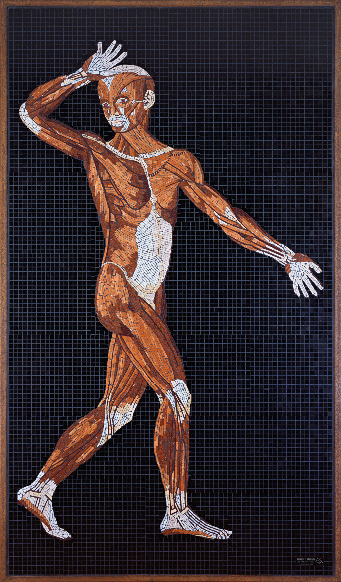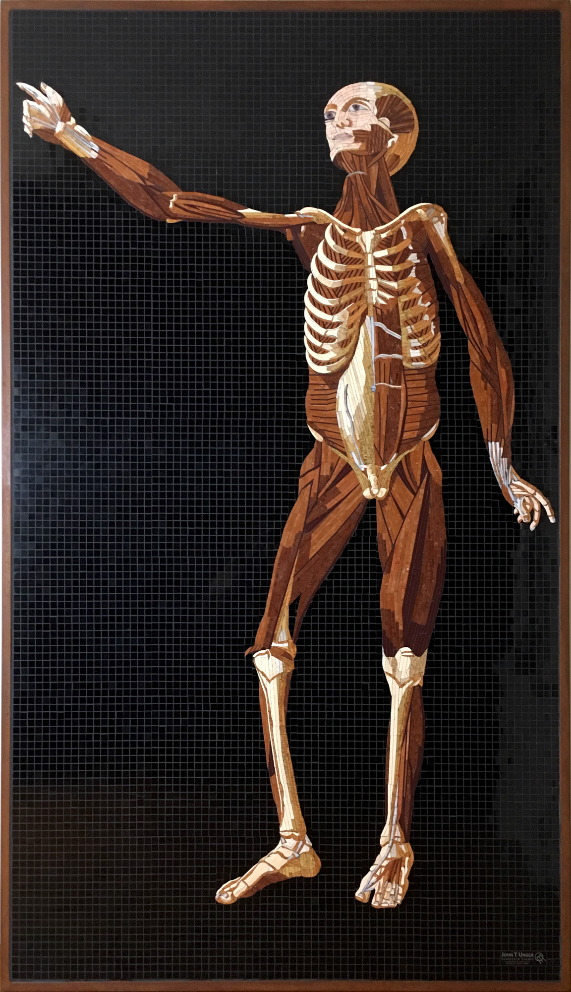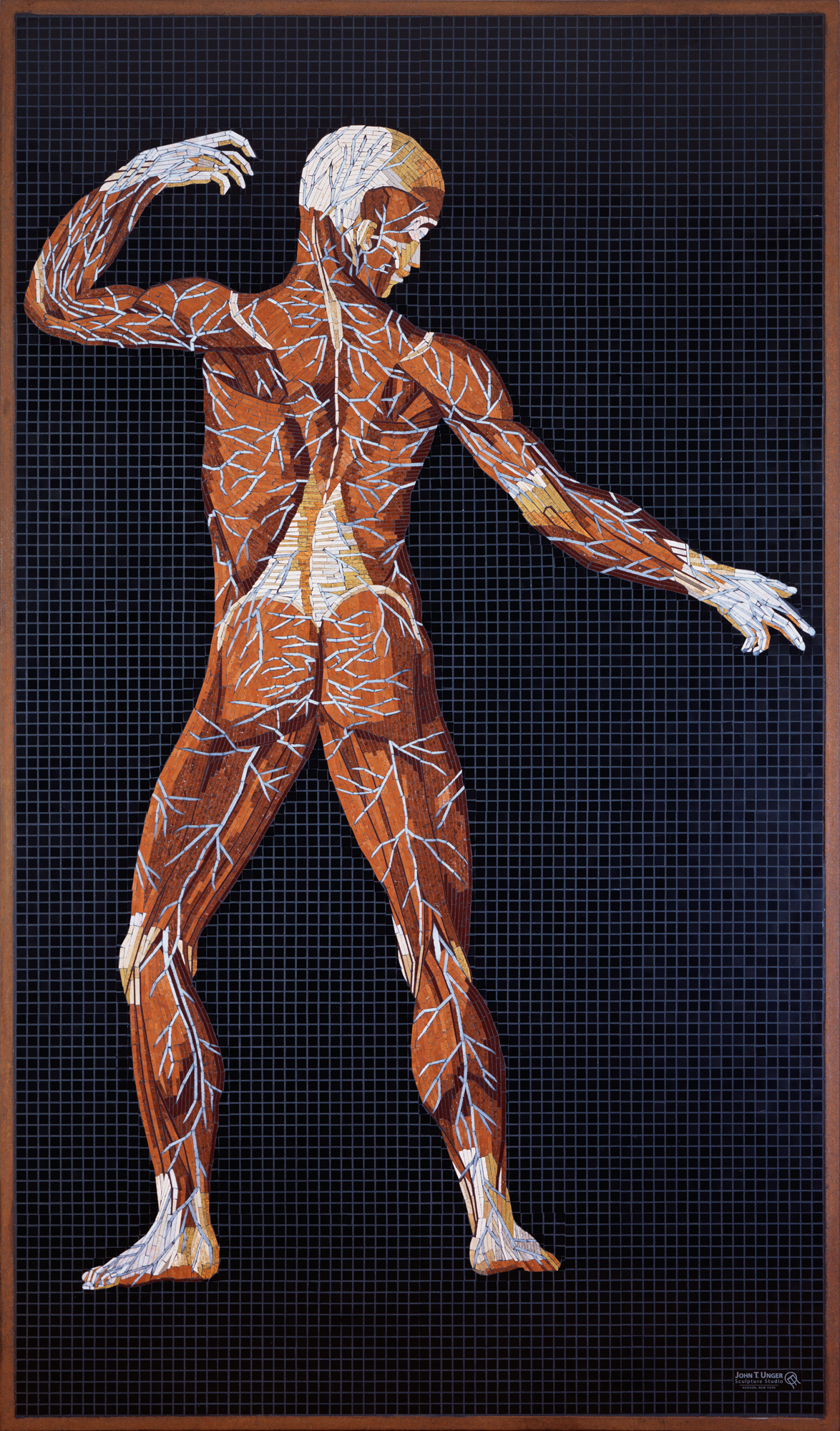 The structure within us all comes to life in these mosaics. Anatomy Set in Stone translates Bartolomeo Eustachi’s sixteenth-century engravings into marble, travertine, onyx, and precious gems: veins and arteries in lapis lazuli and red jasper, eyes beveled in star ruby, sapphire, and tiger eye. Twenty-two figures, each at life size, executed with a painterly precision rarely seen since the Renaissance. The founding work of the Museum of Mosaic Environments.