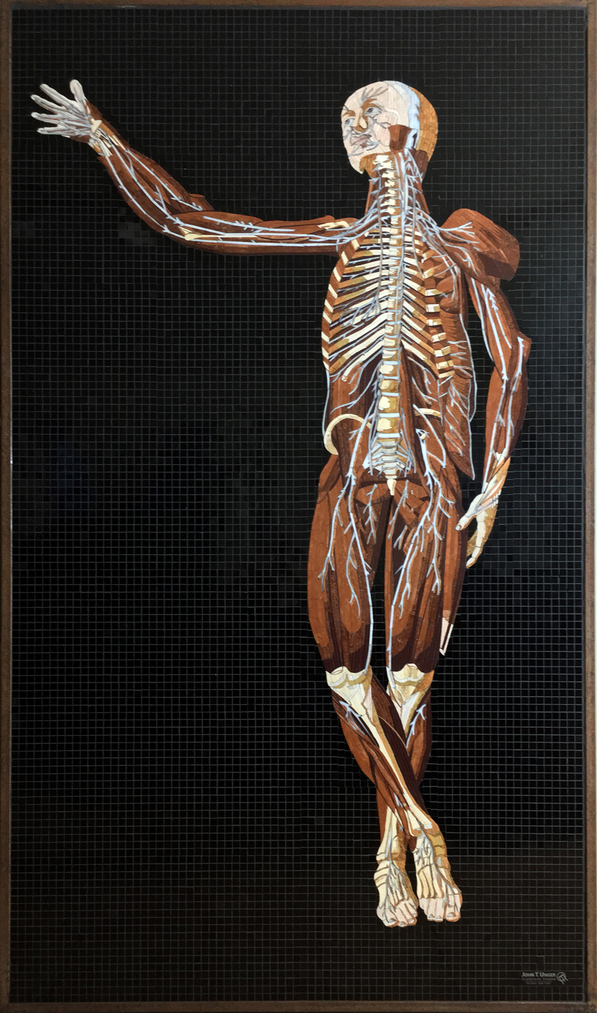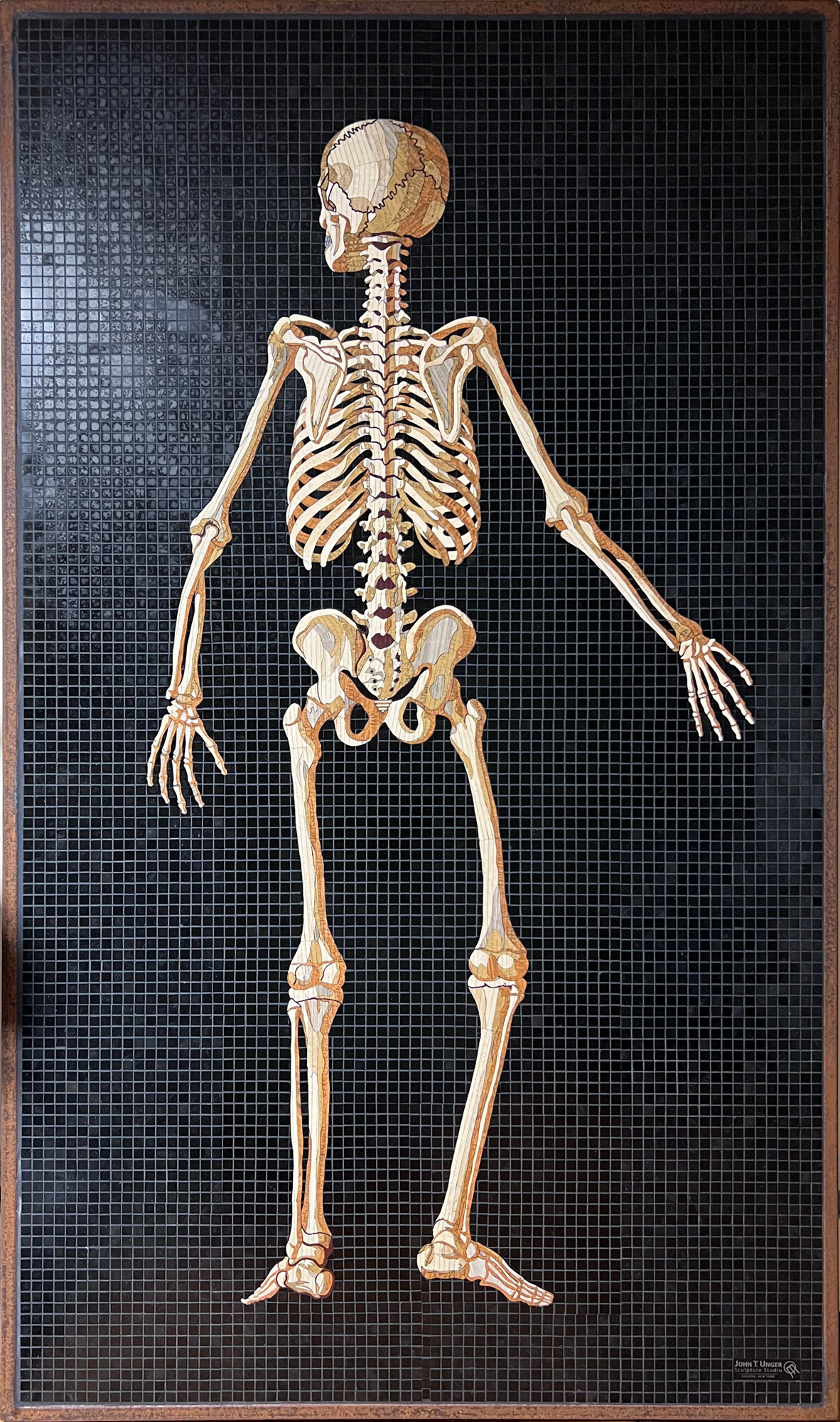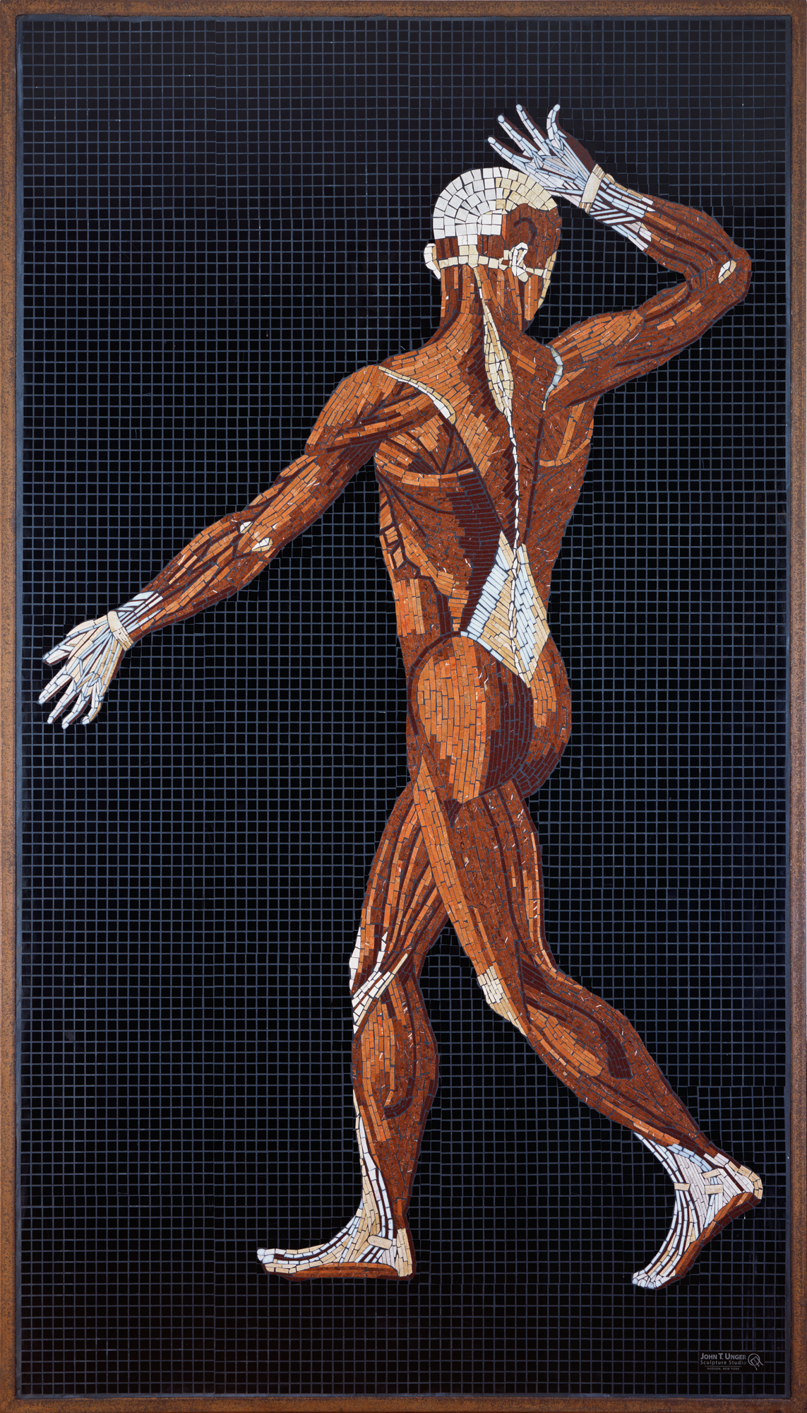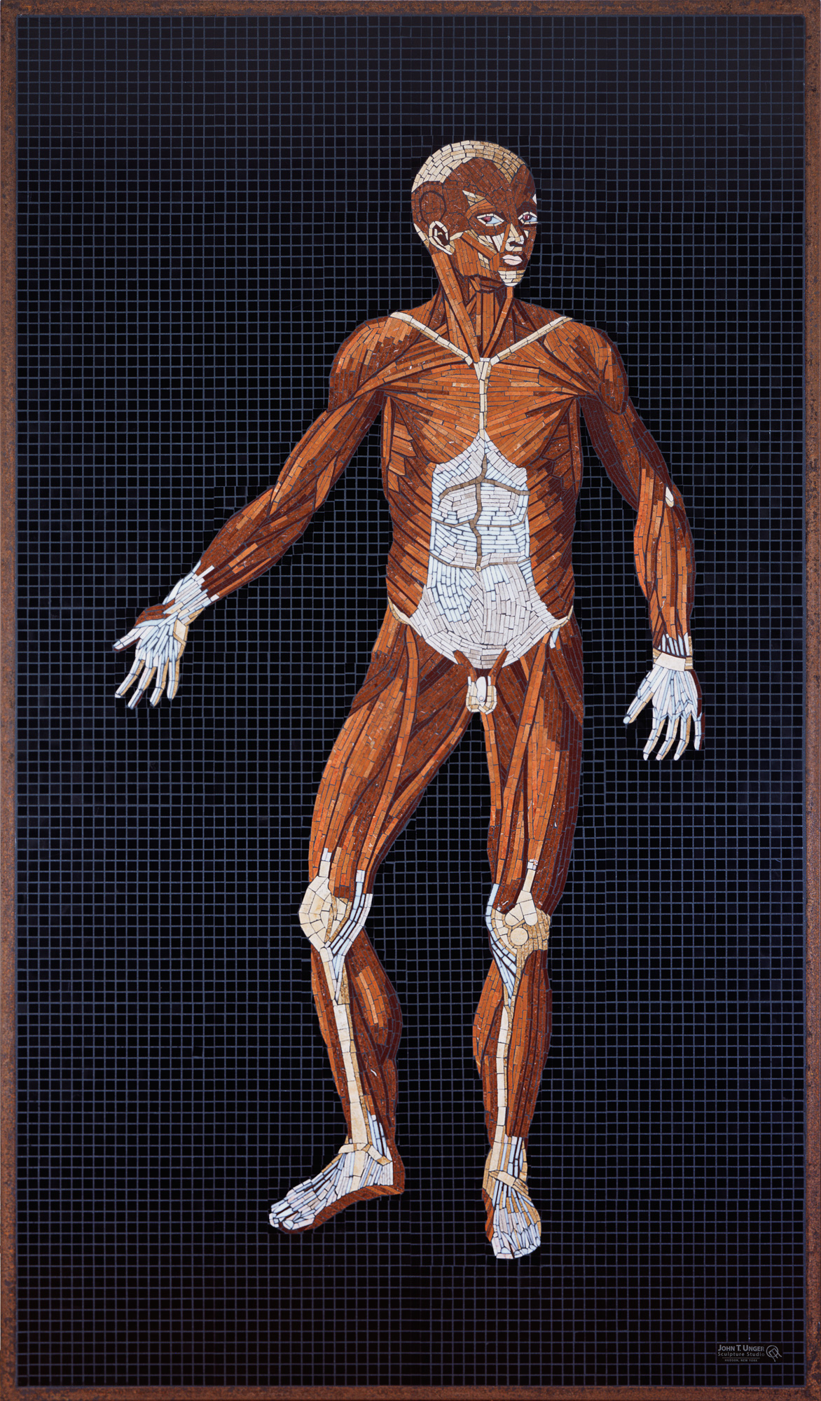 The structure within us all comes to life in these mosaics. Anatomy Set in Stone translates Bartolomeo Eustachi’s sixteenth-century engravings into marble, travertine, onyx, and precious gems: veins and arteries in lapis lazuli and red jasper, eyes beveled in star ruby, sapphire, and tiger eye. Twenty-two figures, each at life size, executed with a painterly precision rarely seen since the Renaissance. The founding work of the Museum of Mosaic Environments.