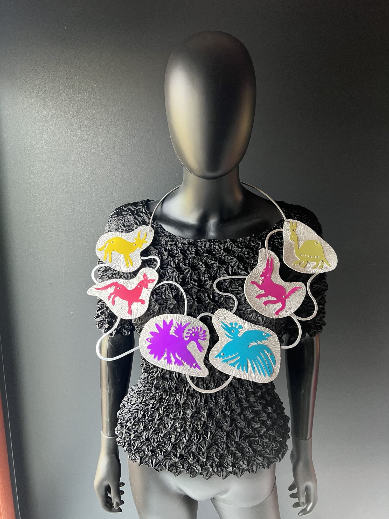 Another advantage of Aluminum is its light weight. I can do large statement pieces which are comfortable to wear because they weight so little. The same work in silver or gold would send you straight to the chiropractor.