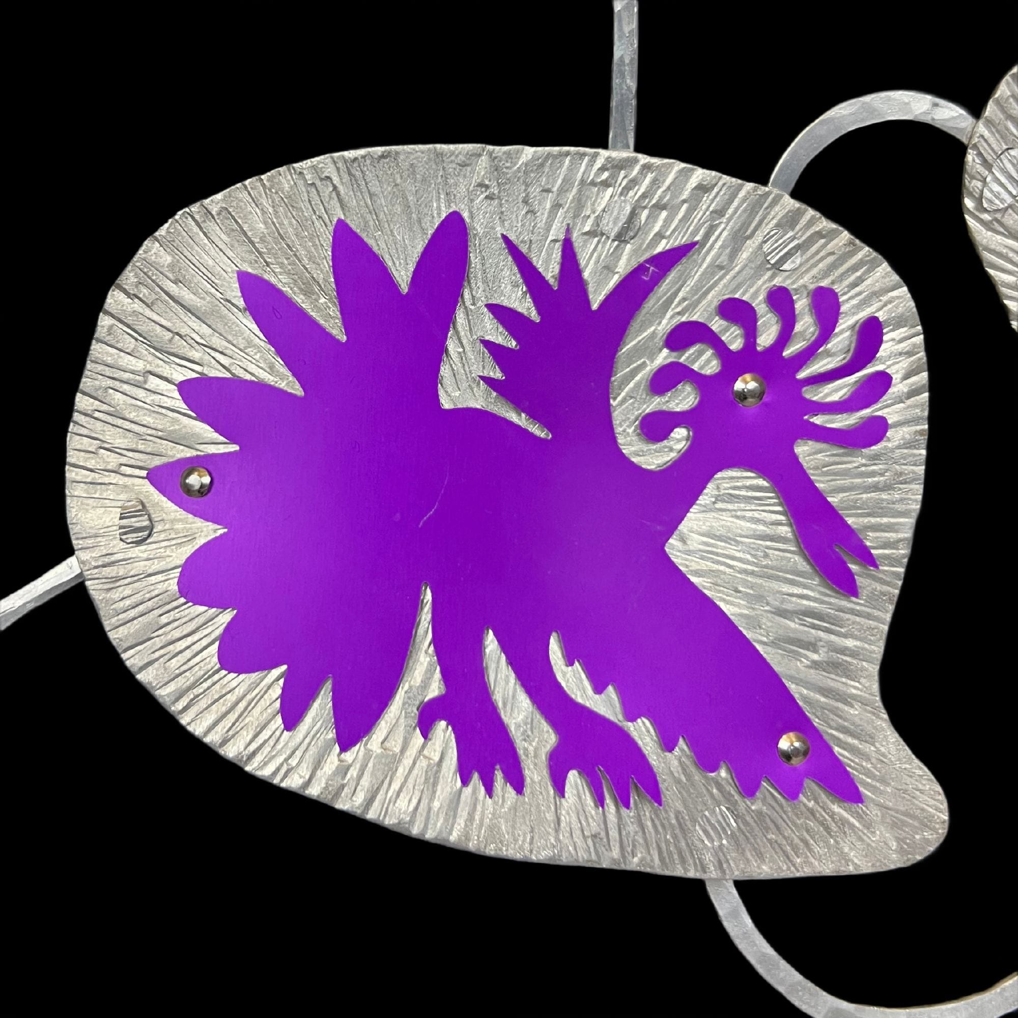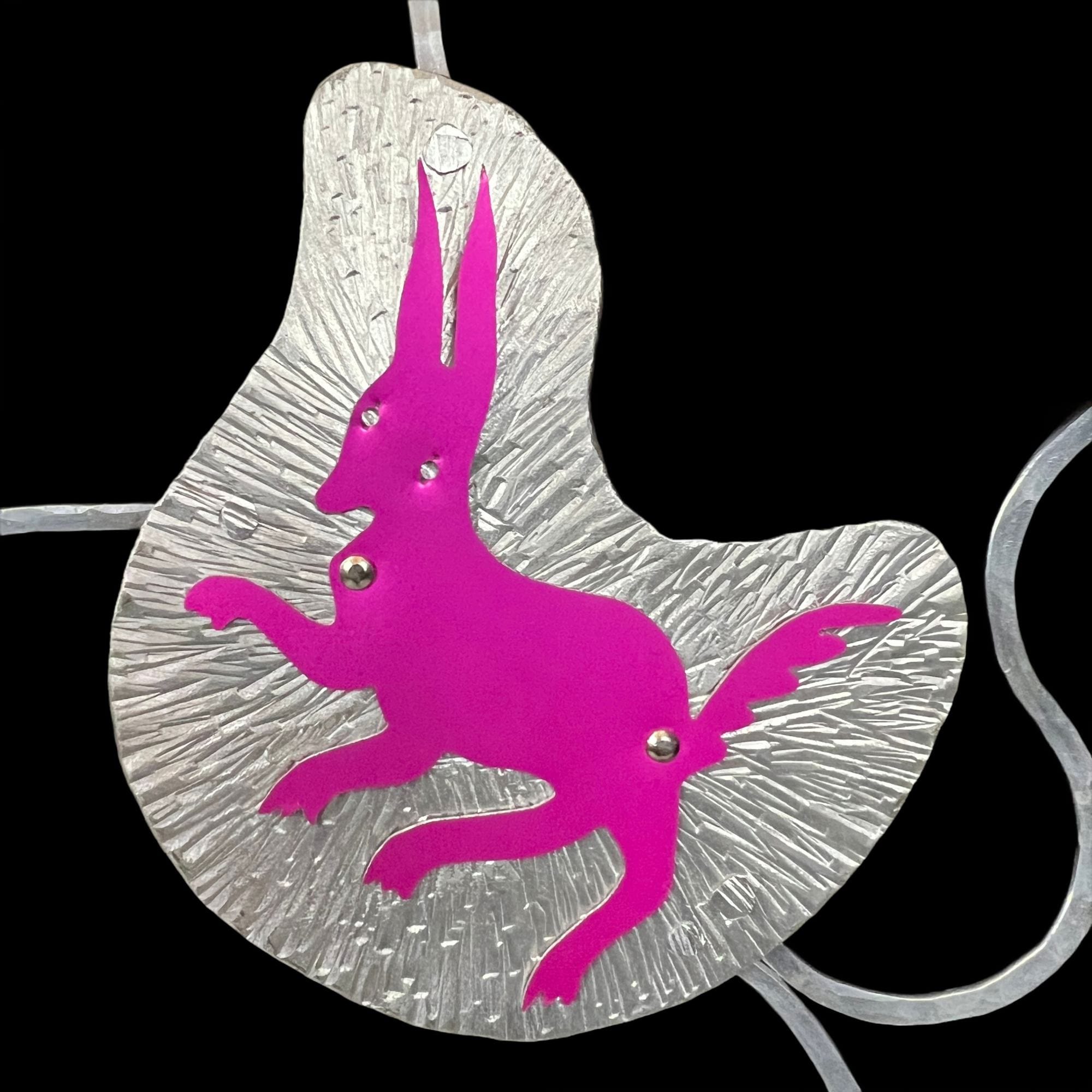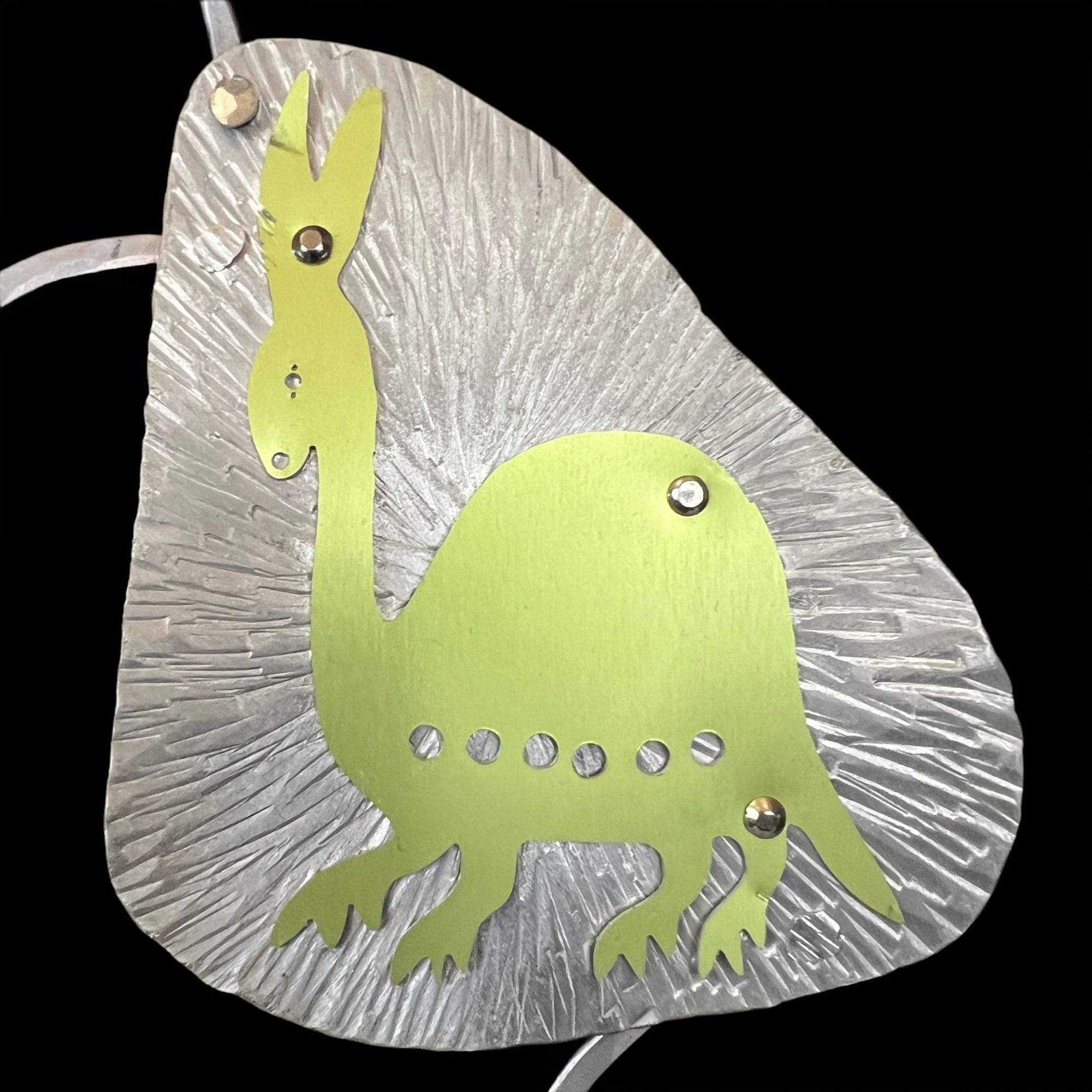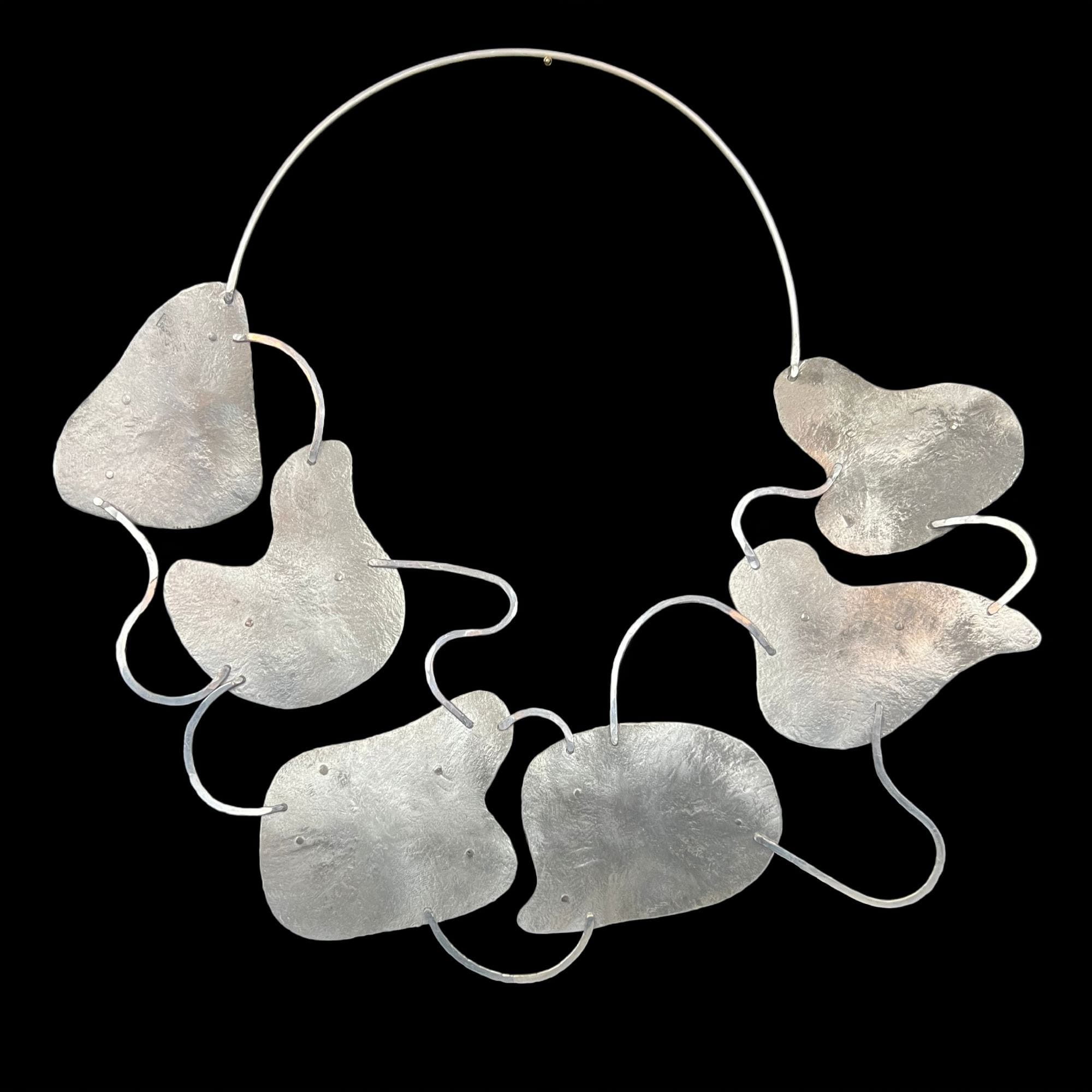 Pieces are joined with heavy wire from salvaged aluminum electrical cables which pierce the plate and are hammered into rivet heads. I developed this technique to control exactly where pieces hang in space in relation to each other (in a way that more flexible connections like chain, cord or links would not). I may be the first artist to use this technique… none of the jewelry experts I have consulted have seen it elsewhere.