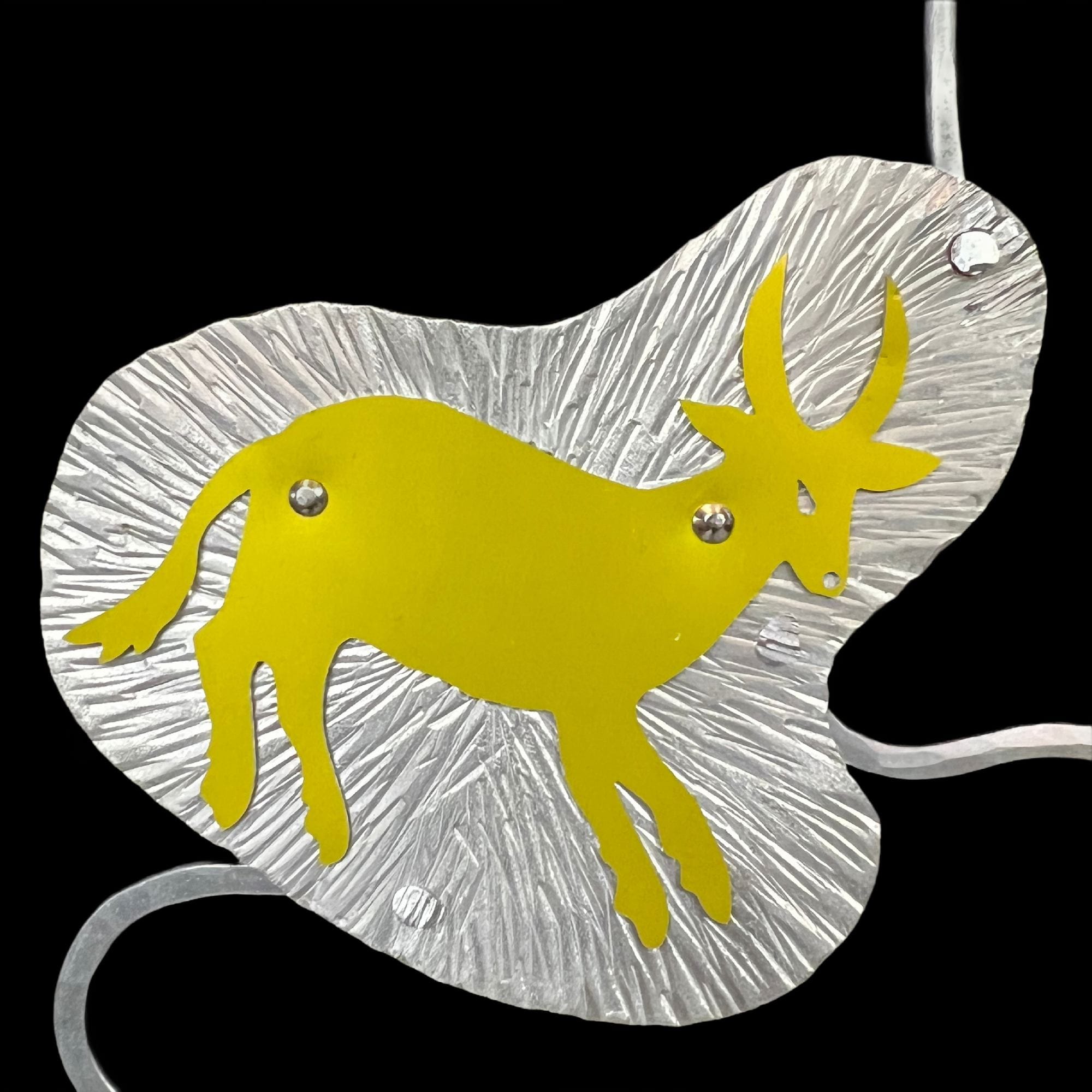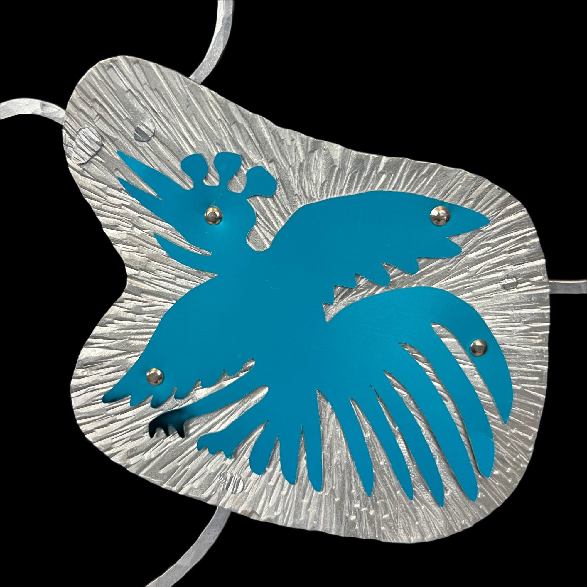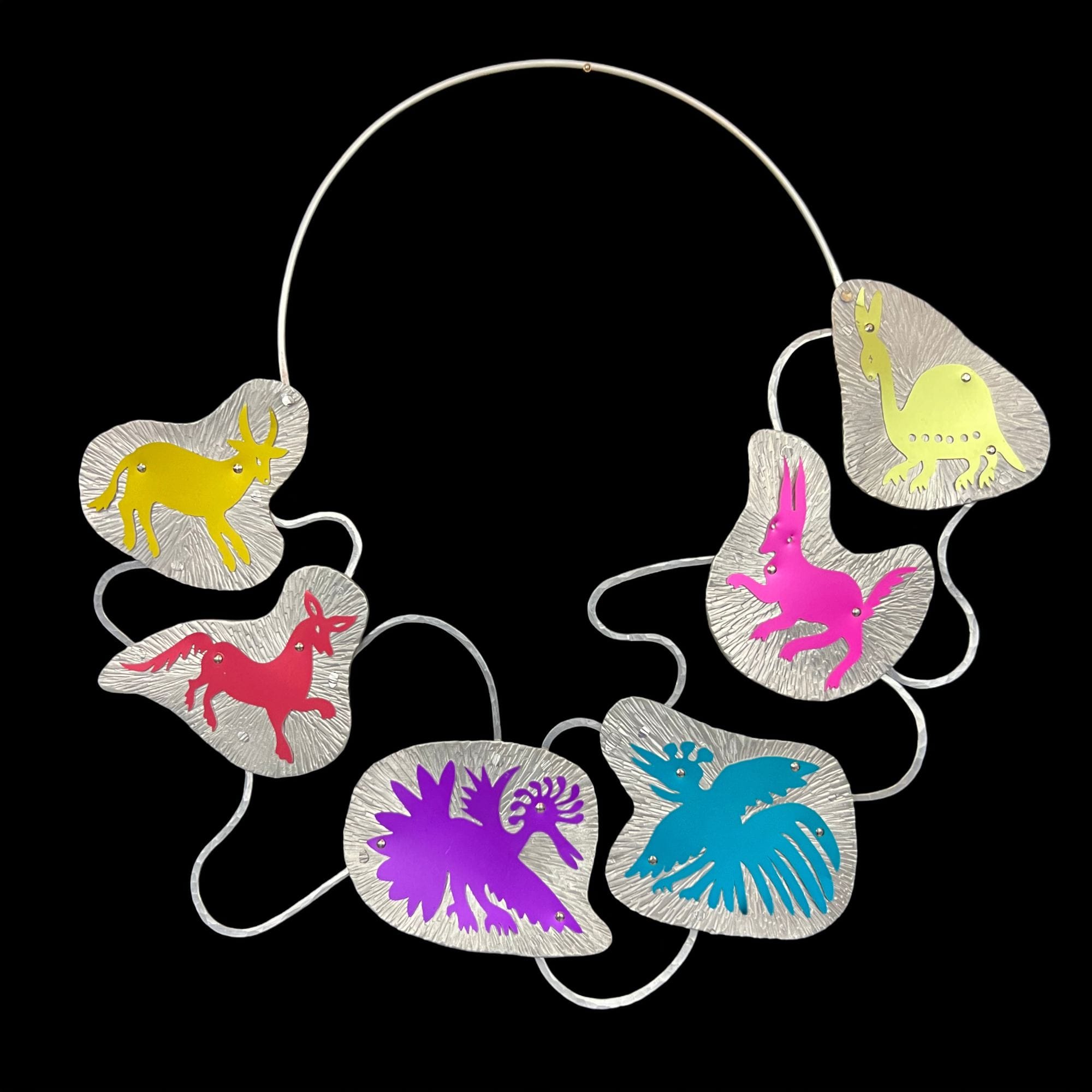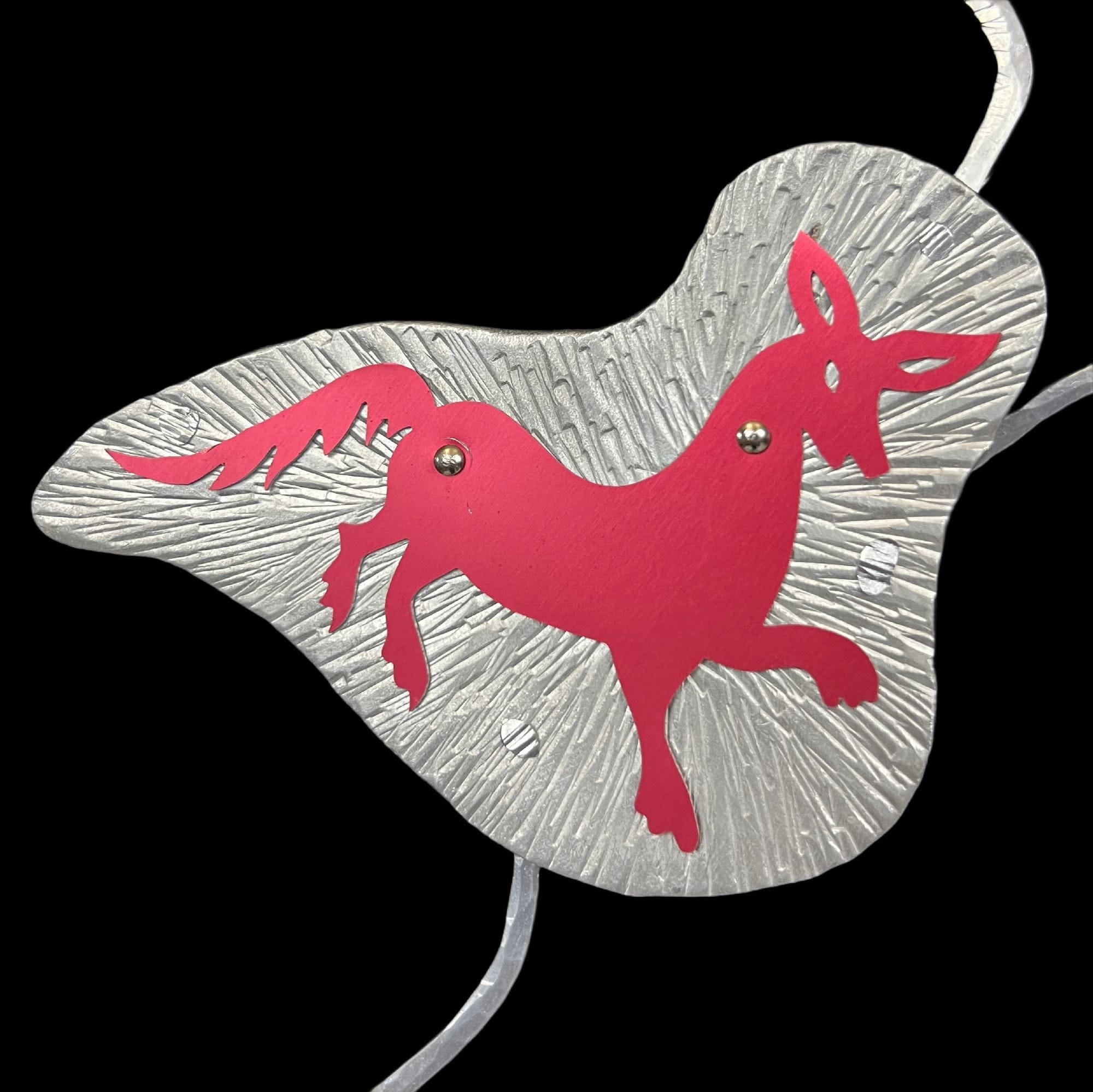 Pieces are joined with heavy wire from salvaged aluminum electrical cables which pierce the plate and are hammered into rivet heads. I developed this technique to control exactly where pieces hang in space in relation to each other (in a way that more flexible connections like chain, cord or links would not). I may be the first artist to use this technique… none of the jewelry experts I have consulted have seen it elsewhere.