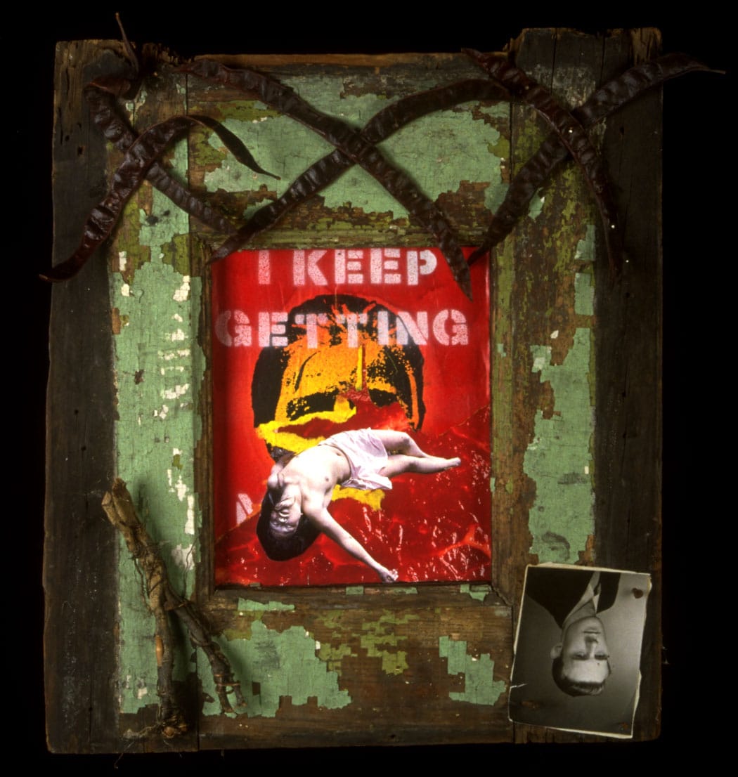 Crossed draws from various Hoodoo folk magics. The pods at the top are locust beans, alluding to biblical plagues. The poster that forms the top element of the collage was used as found. the hanging phrase seems more ominous than any finished sentence would be.
