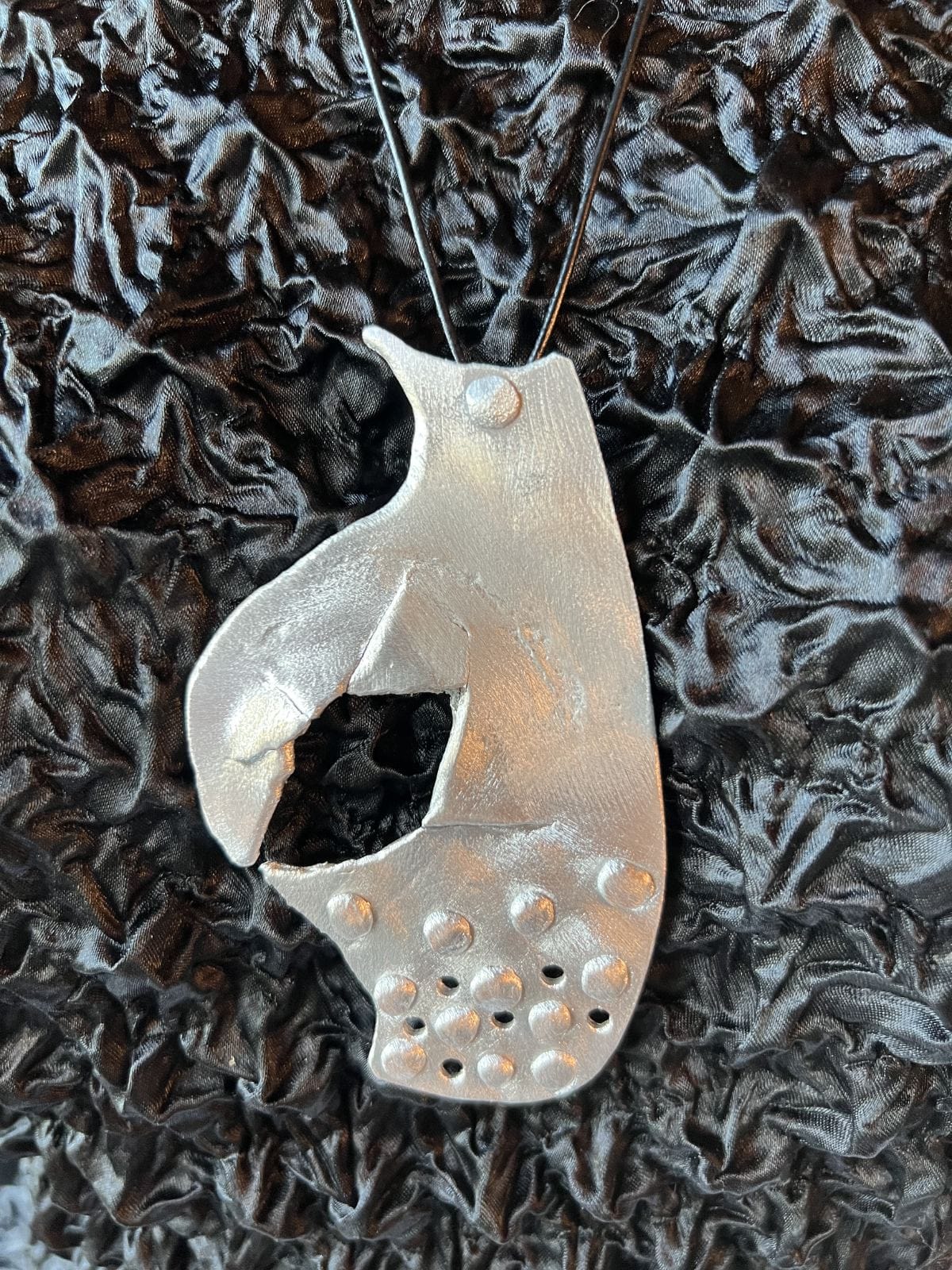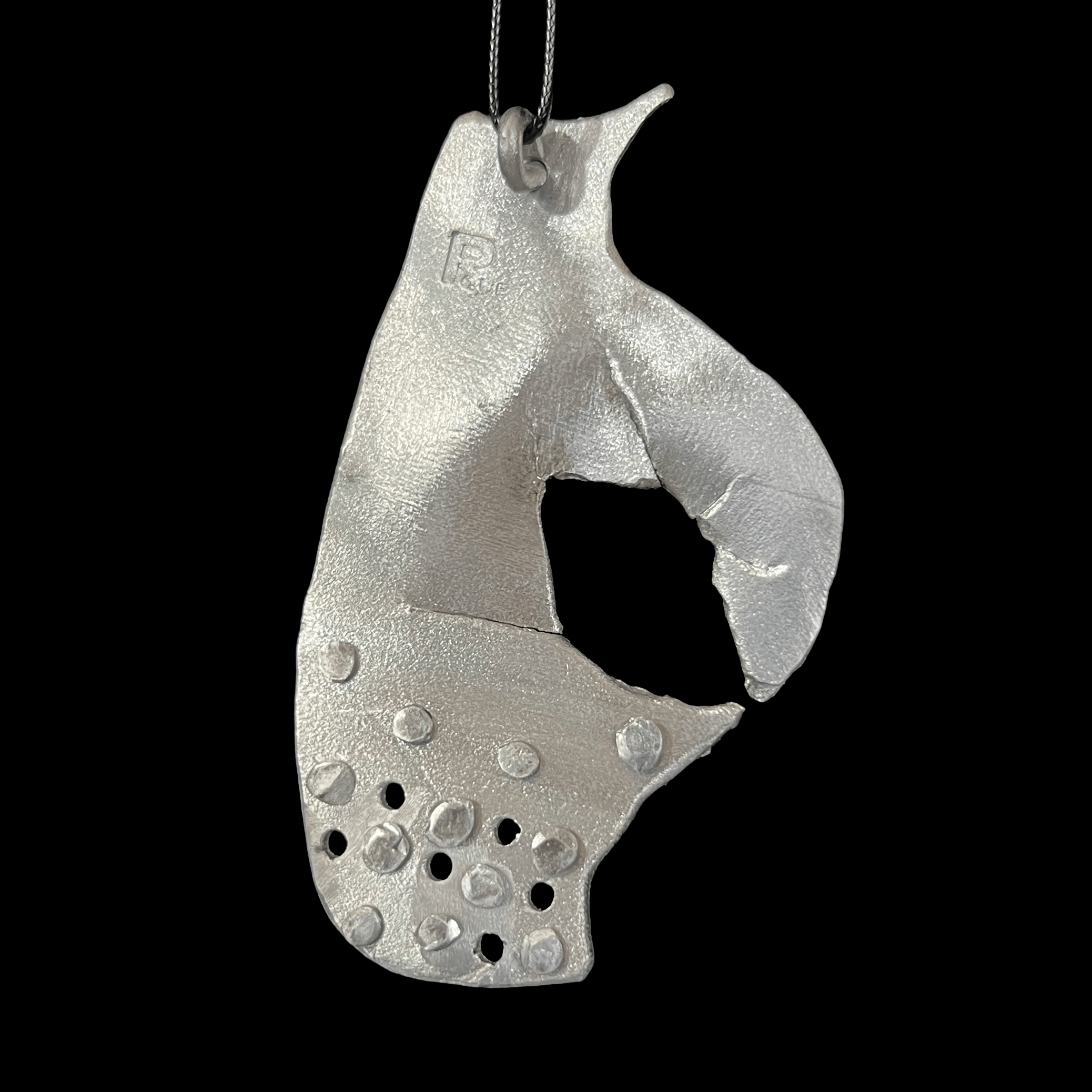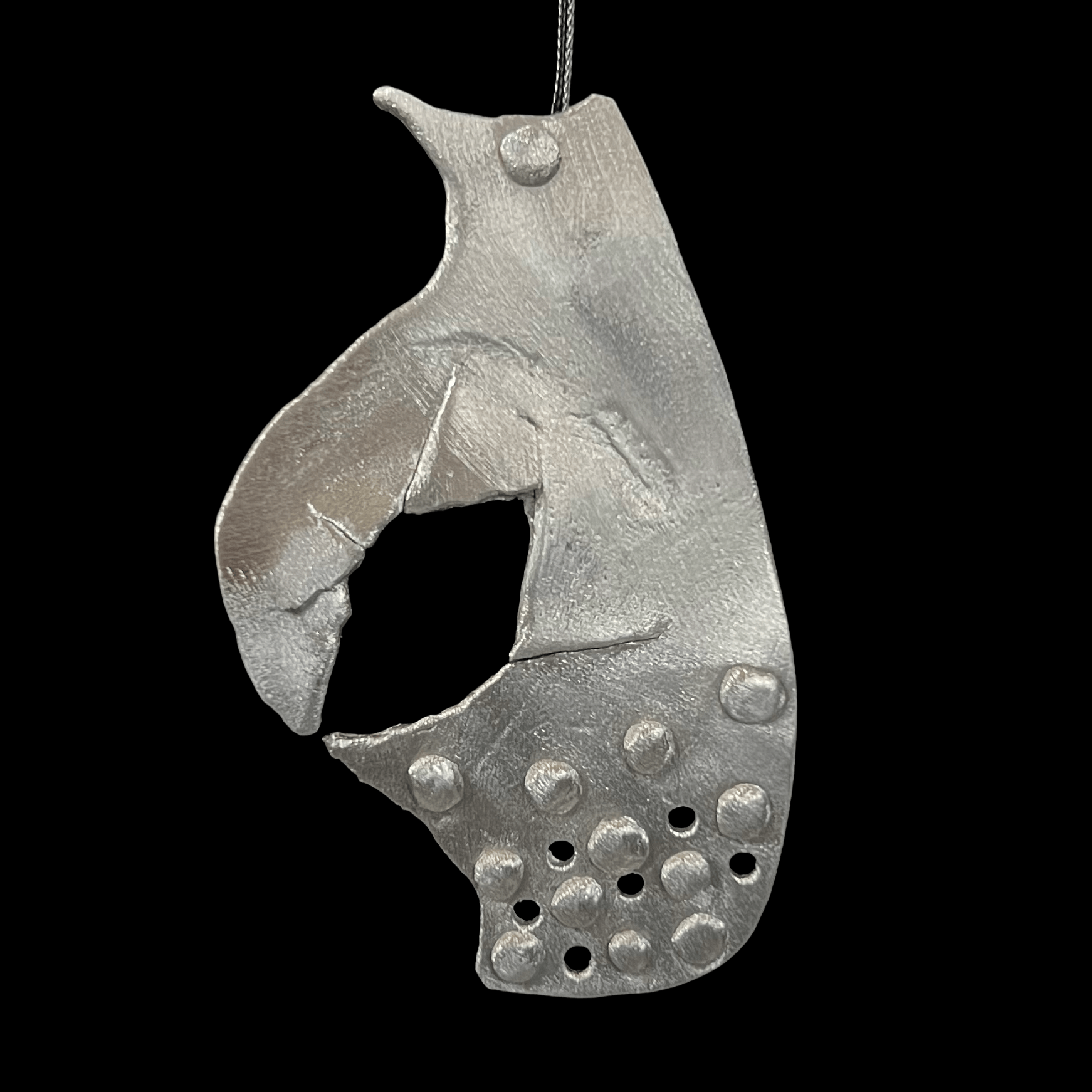 Pieces are joined with heavy wire from salvaged aluminum electrical cables which pierce the plate and are hammered into rivet heads. I developed this technique to control exactly where pieces hang in space in relation to each other (in a way that more flexible connections like chain, cord or links would not). I may be the first artist to use this technique… none of the jewelry experts I have consulted have seen it elsewhere.