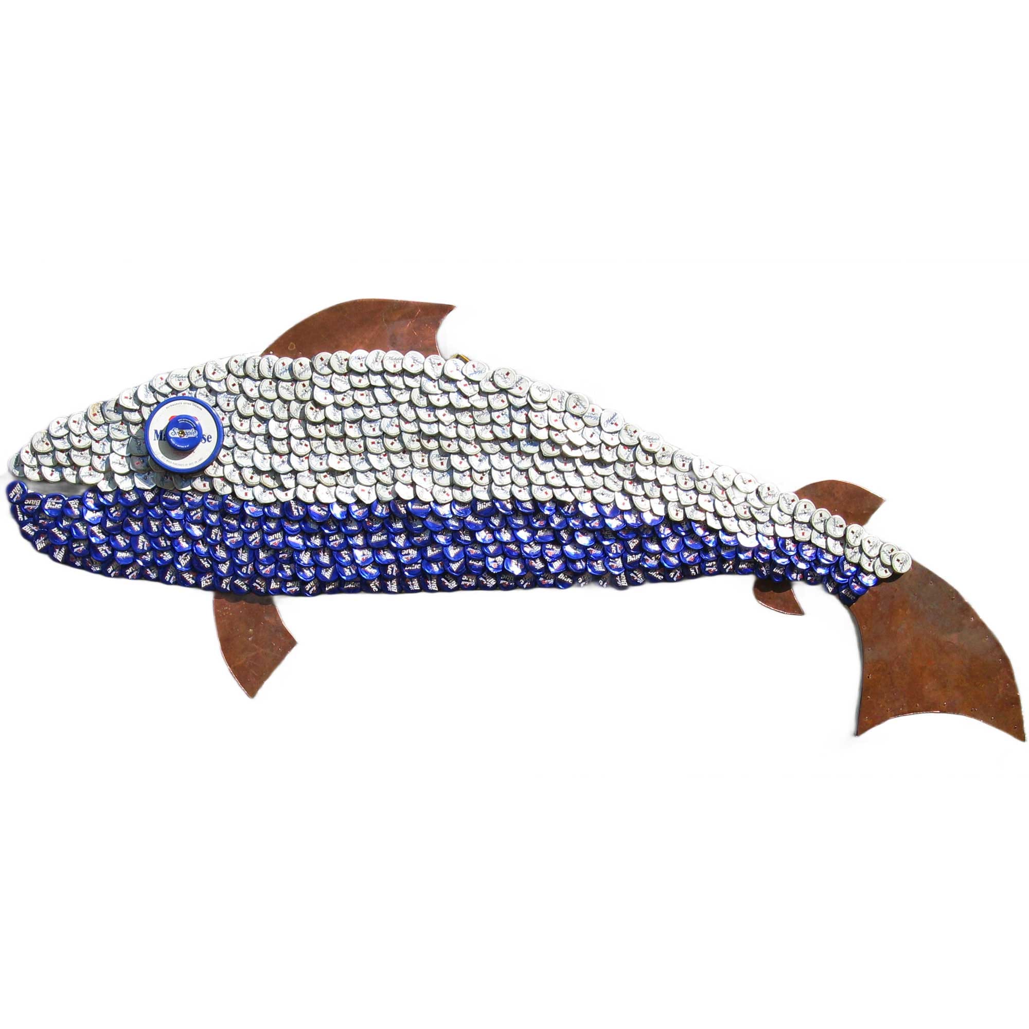 This fish is made from Labatt Blue and Michelob Ultra bottle caps. The plywood is primed with two layers of Kilz primer and can be hung outdoors (but the caps may fade if you hang it in direct sunlight). The fins and tale are cut from recycled roofing copper.