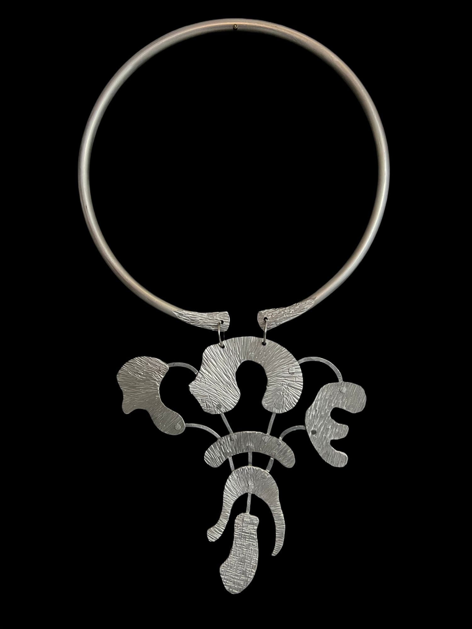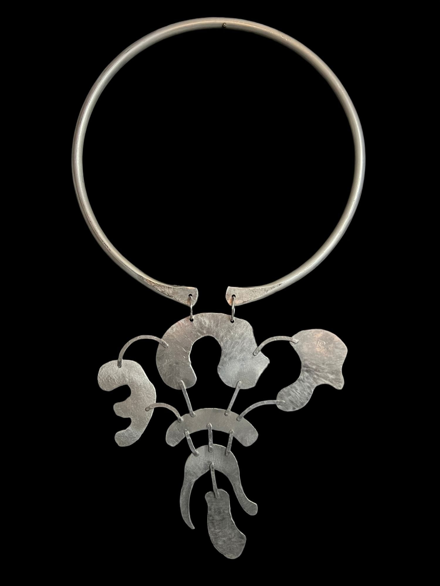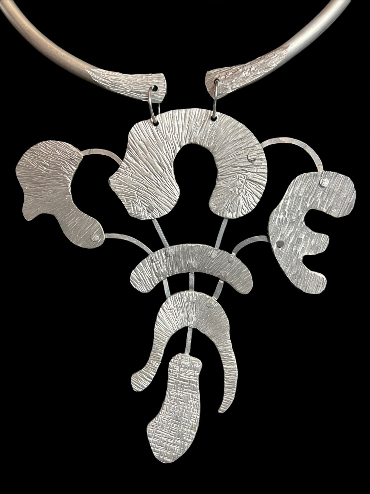 Pieces are joined with heavy wire from salvaged aluminum electrical cables which pierce the plate and are hammered into rivet heads. I developed this technique to control exactly where pieces hang in space in relation to each other (in a way that more flexible connections like chain, cord or links would not). I may be the first artist to use this technique… none of the jewelry experts I have consulted have seen it elsewhere.