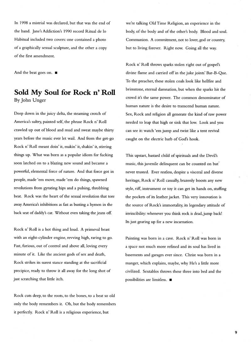 Unger, John T. “Sold My Soul for Rock ‘N Roll”, Sextablos: Works on Metals. Chicago: Luna Books, 1999. 9, 15.